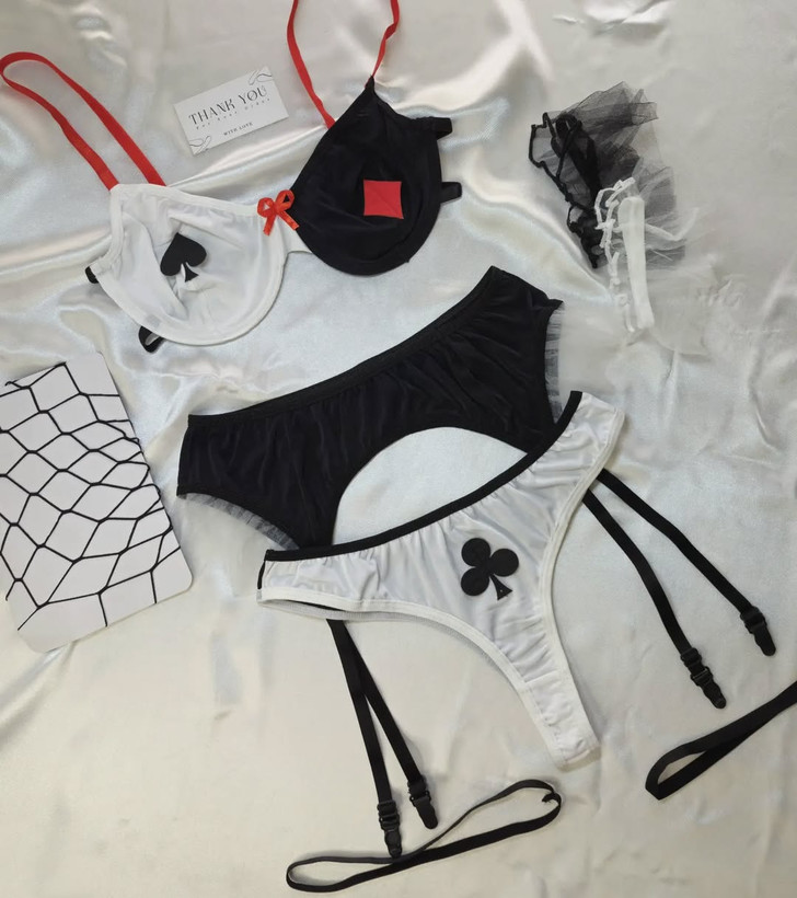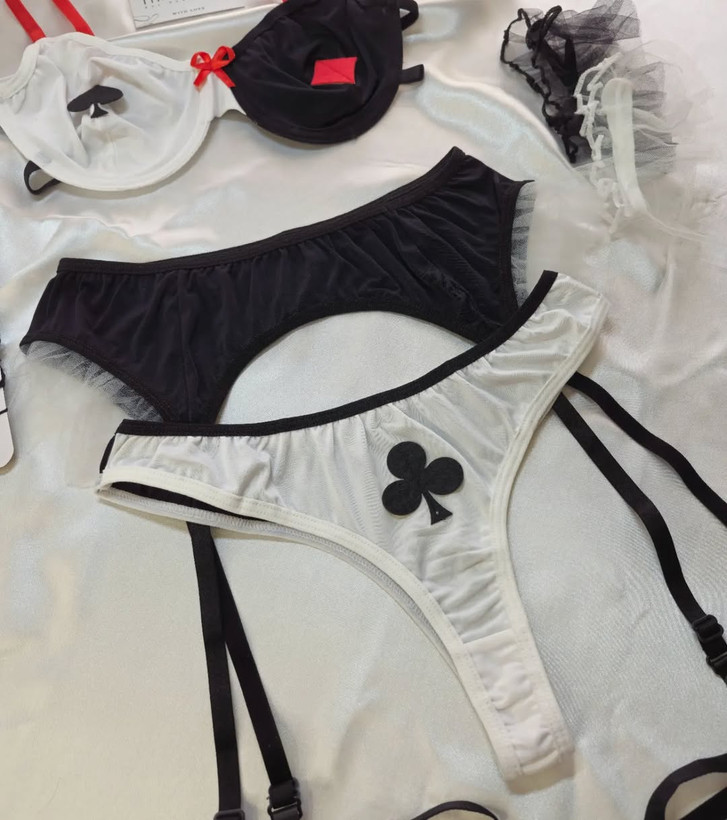 ست شامل سوتین فنردار، شورت، بند جوراب، رانبند، بازوبند سیاه و سفید و جوراب شلواری زنبوری تک رنگ در سایز لارج و ایکس لارج.