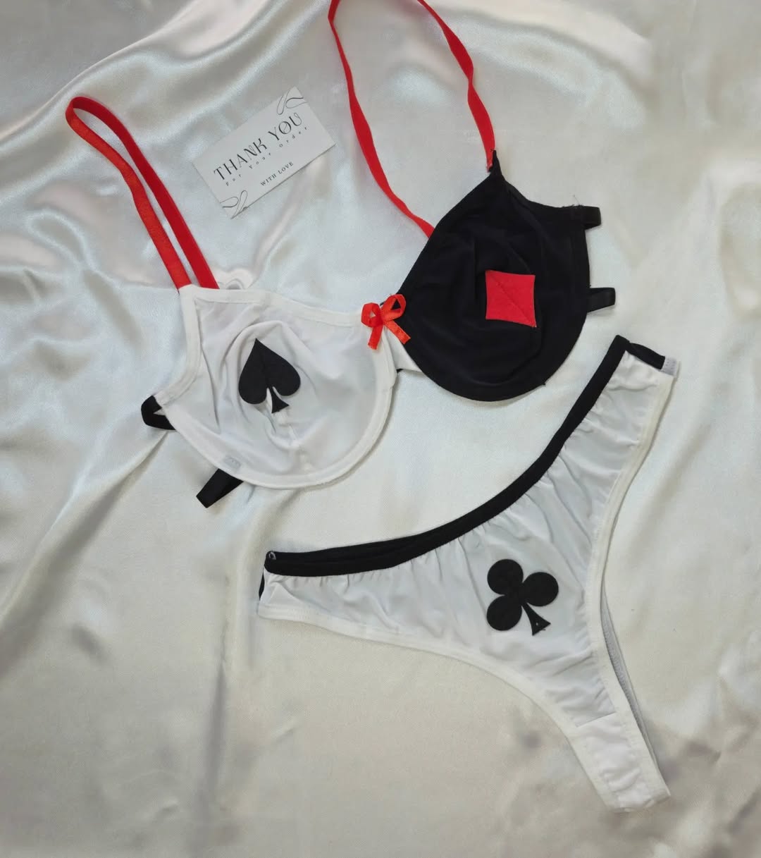 ست شامل سوتین فنردار، شورت، بند جوراب، رانبند، بازوبند سیاه و سفید و جوراب شلواری زنبوری تک رنگ در سایز لارج و ایکس لارج.