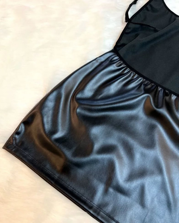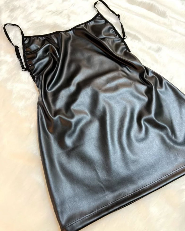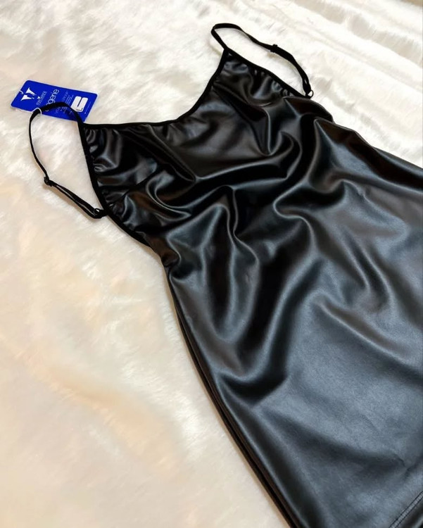 پیراهن چرم لاتکس تک رنگ مشکی مناسب سایزهای ۳۴، ۳۶، ۳۸، ۴۰ نهایت ۴۲ است.