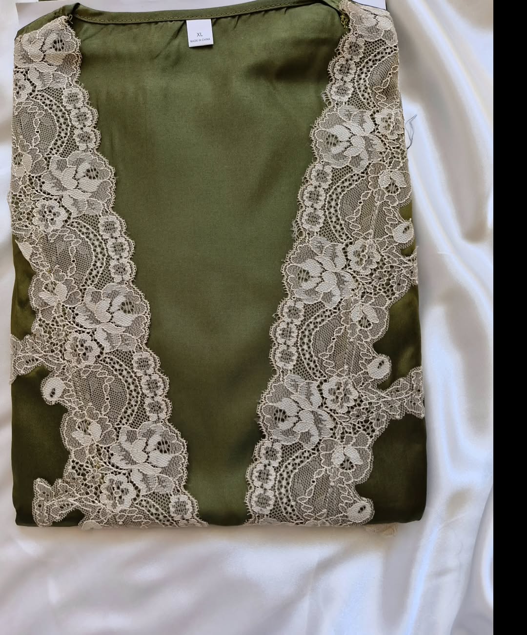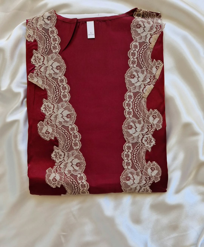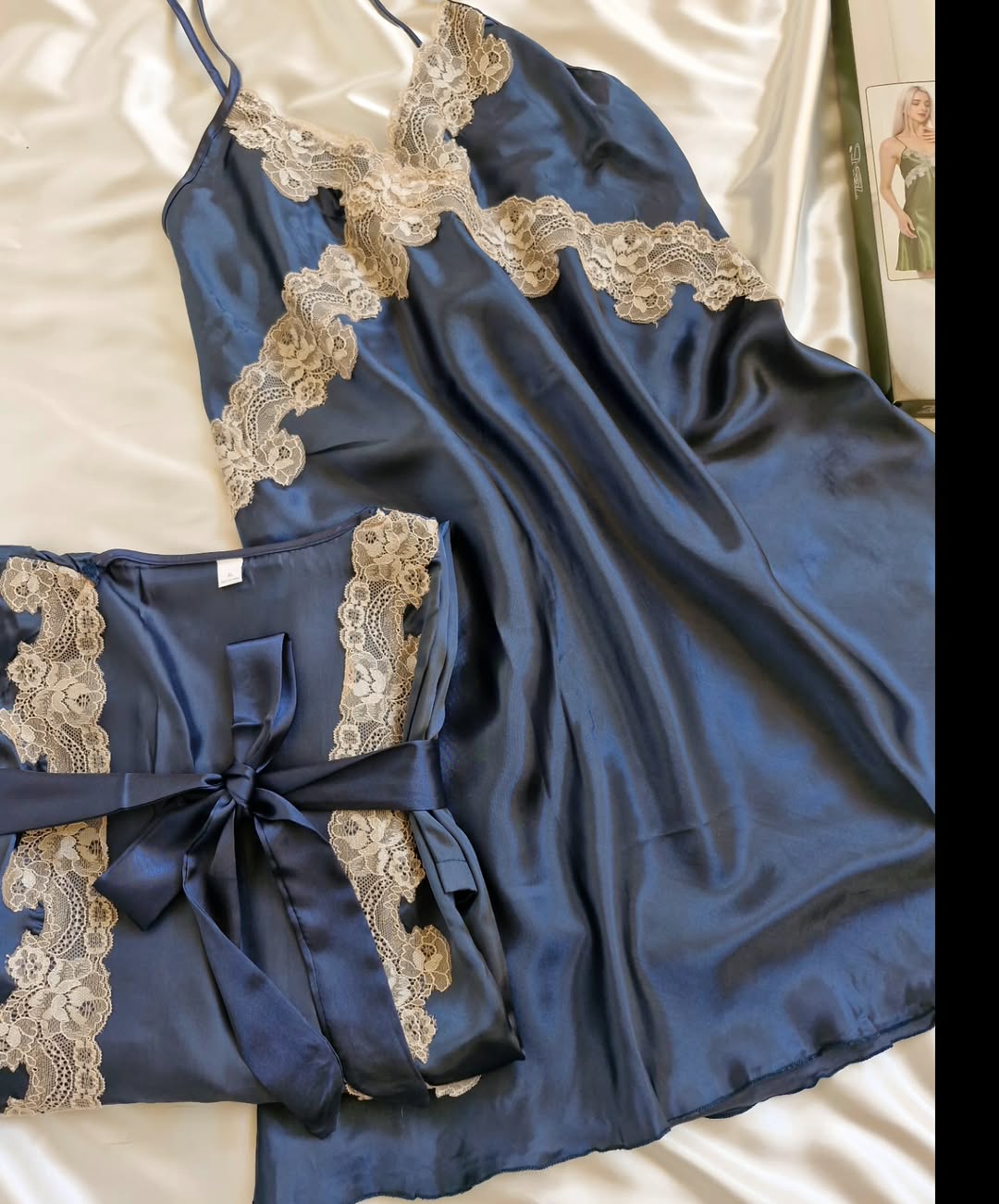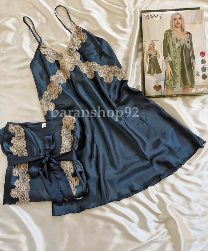 ربدوشامبر و پیراهن ساتن با قد پیراهن ۸۳ و دور سینه پیراهن در حالت بیشترین کشسانی ۱۰۰ و دور سینه ربدو ۱۲۶. رنگ بندی: سورمه ای، سبز زیتونی، مشکی، زرشکی.