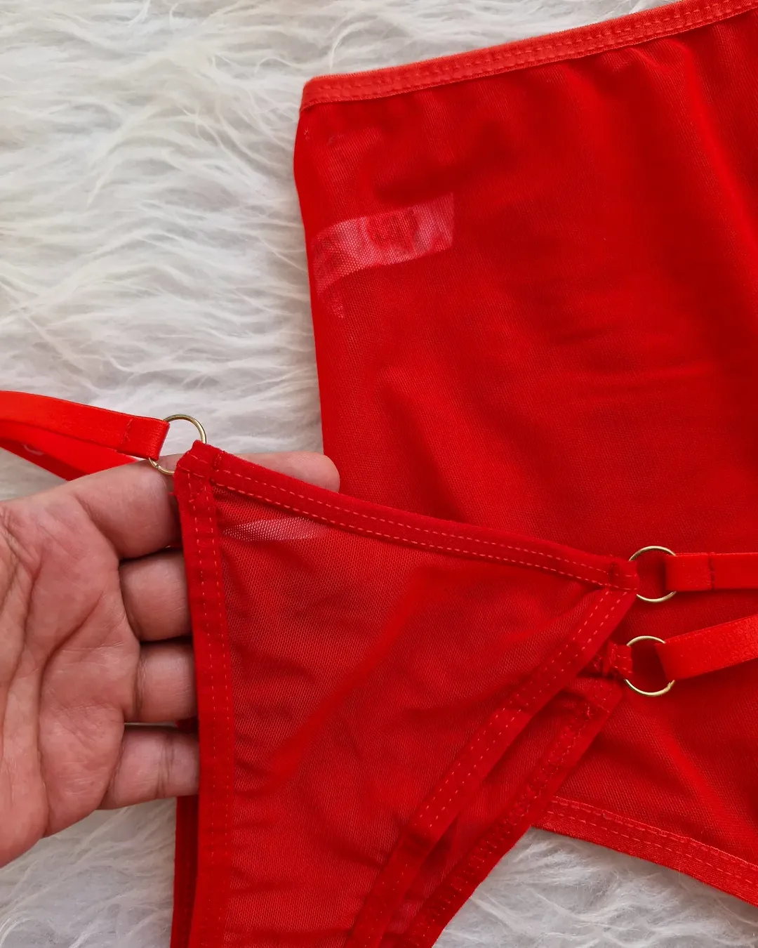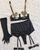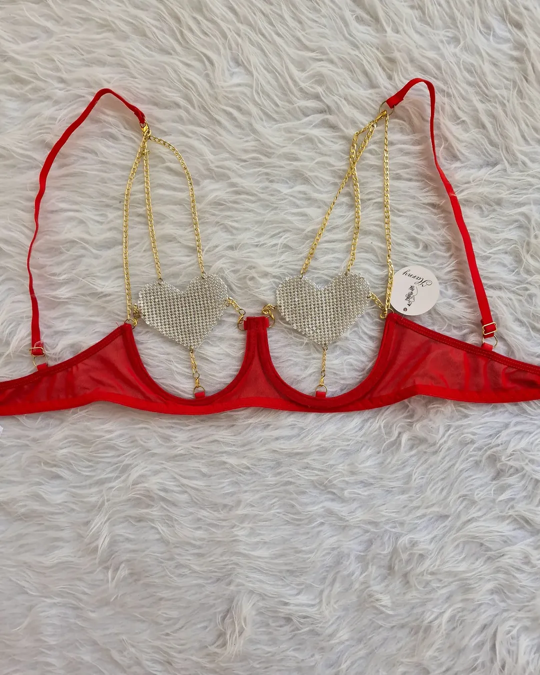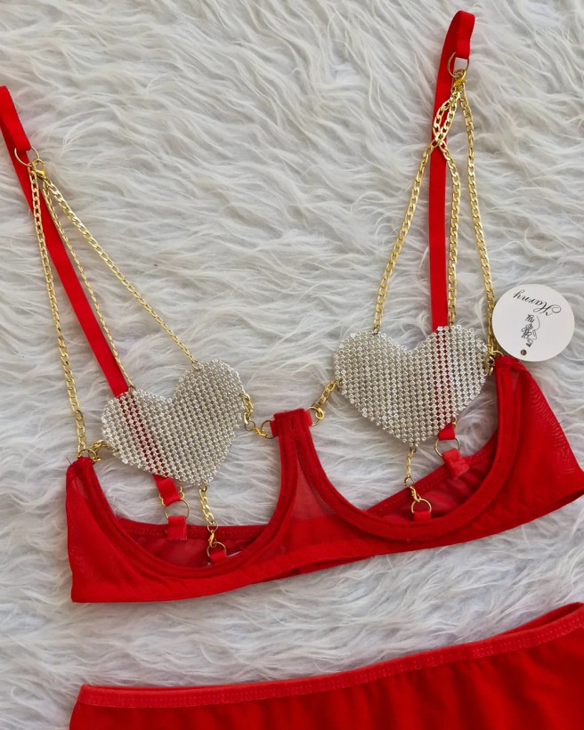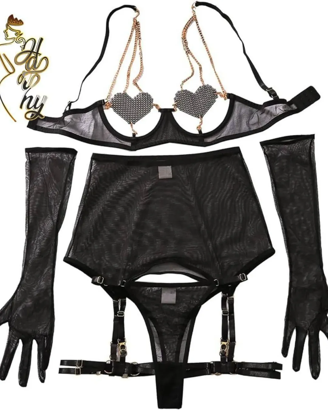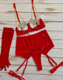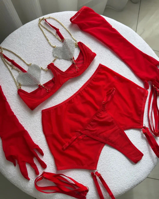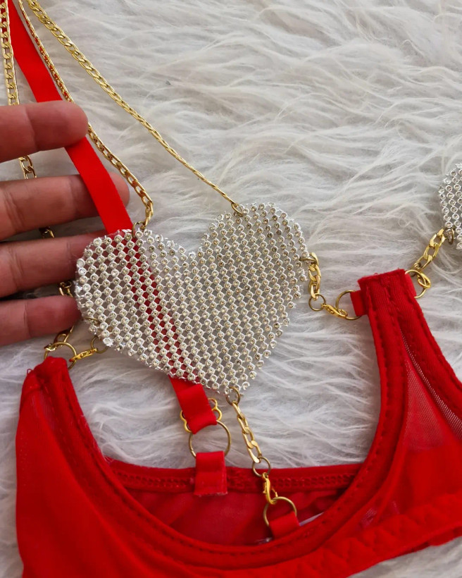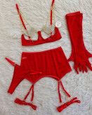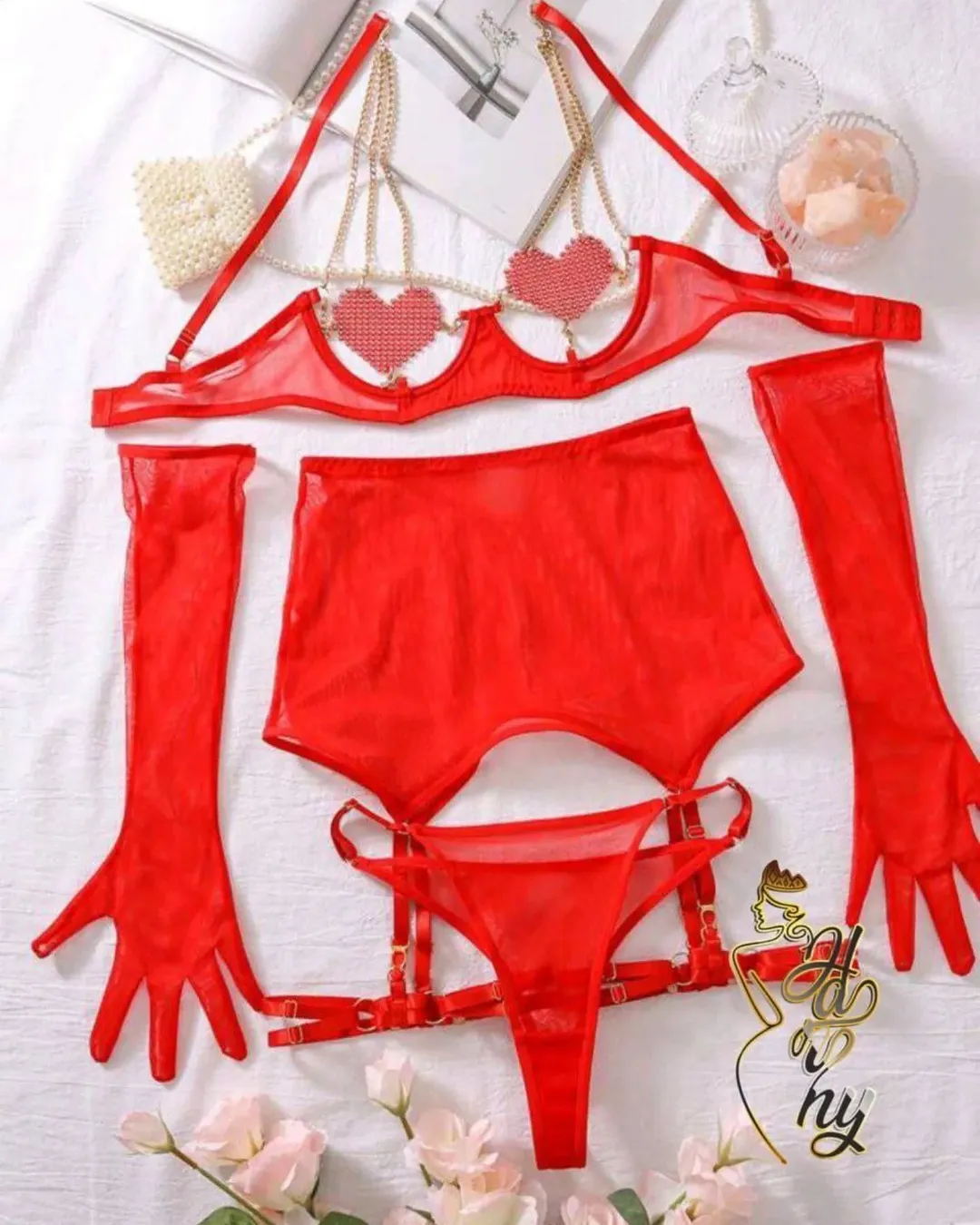ست فانتزی قلبی شامل سوتین جلو باز و دستکش و دامن و گارتر و شورت