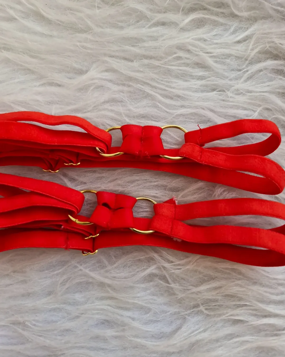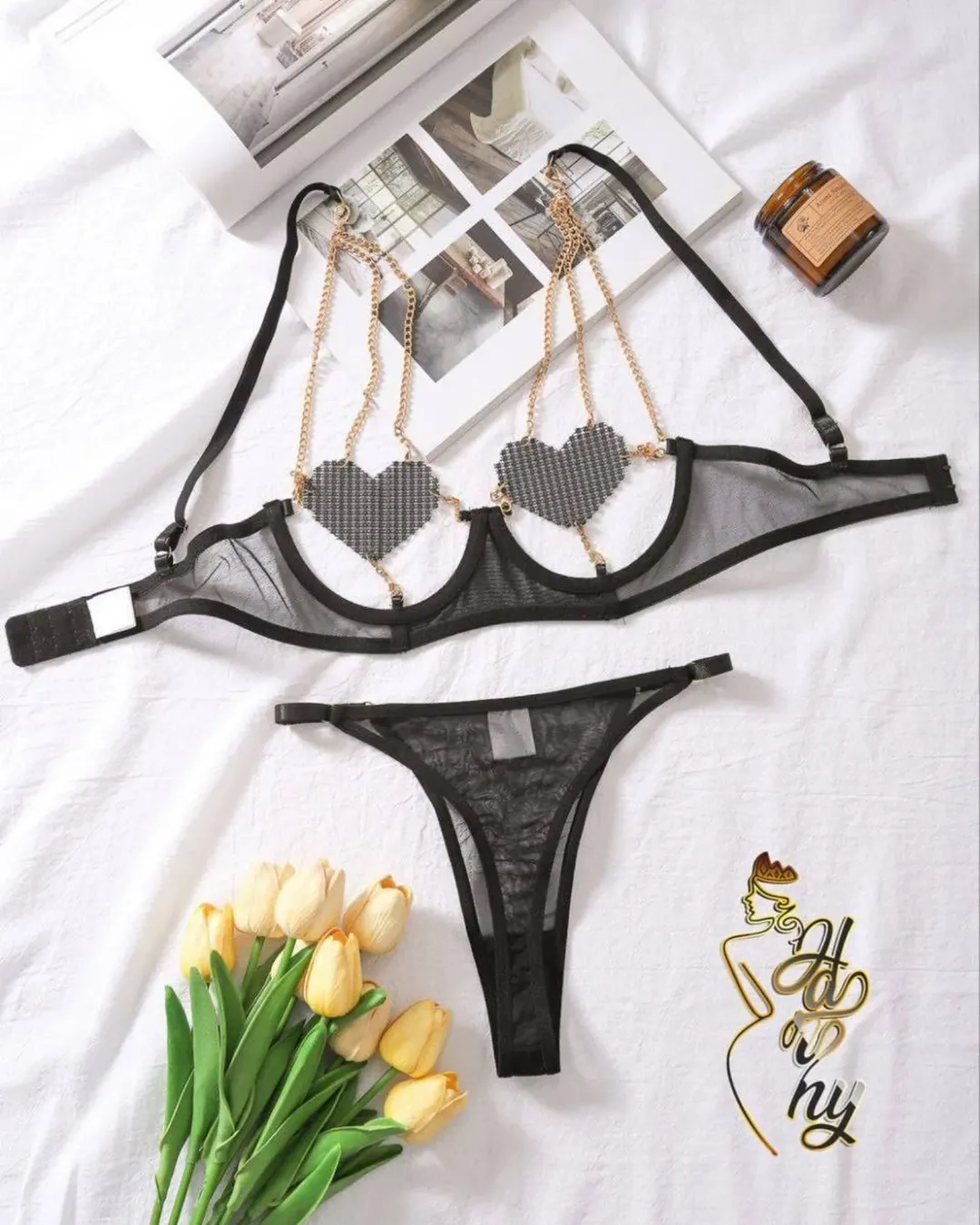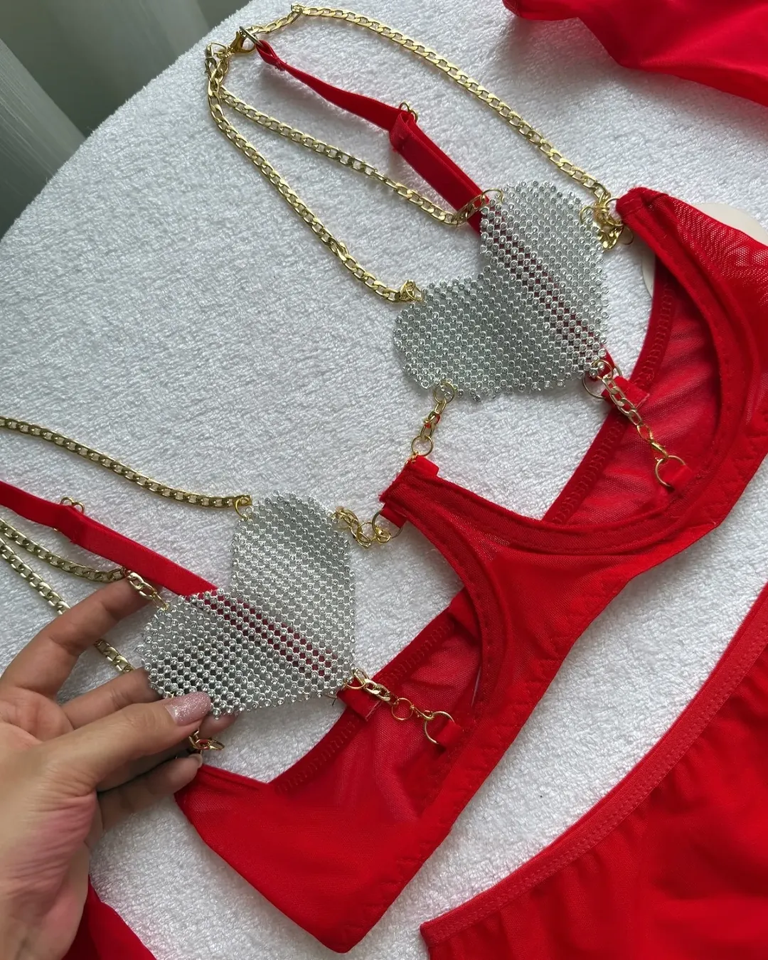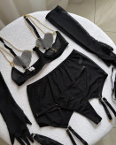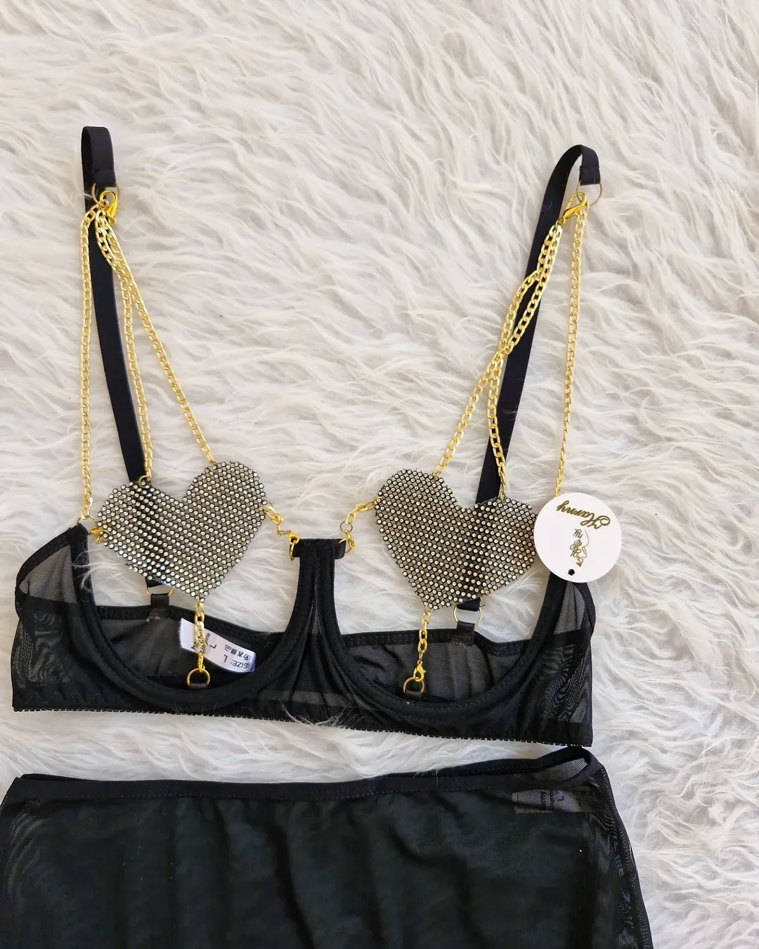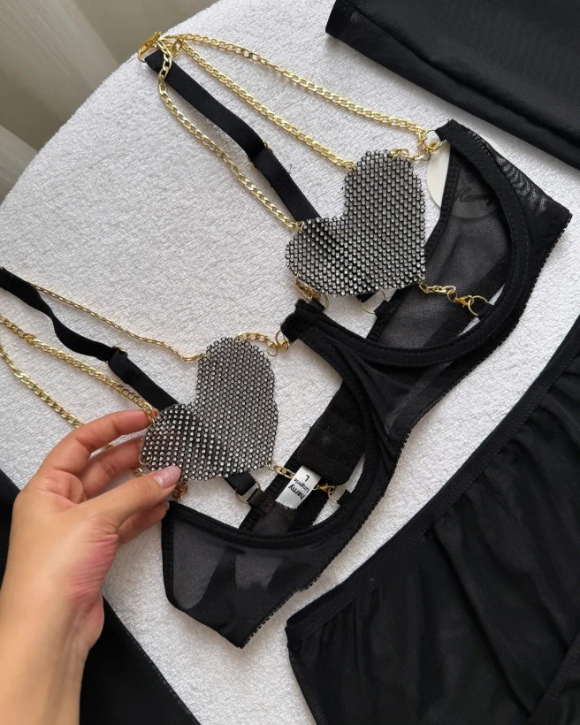 ست فانتزی قلبی شامل سوتین جلو باز و دستکش و دامن و گارتر و شورت